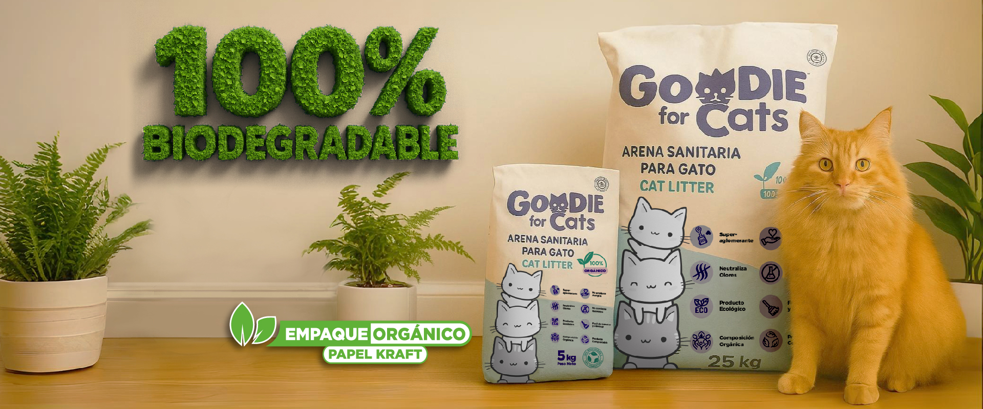 Arena 100% orgánica, compostable y reutilizable, súper aglomerante, libre de químicos y suave con sus patitas. Controla olores, no produce alergias y mantiene su espacio siempre fresco. Comodidad real para tu gato, tranquilidad total para ti.