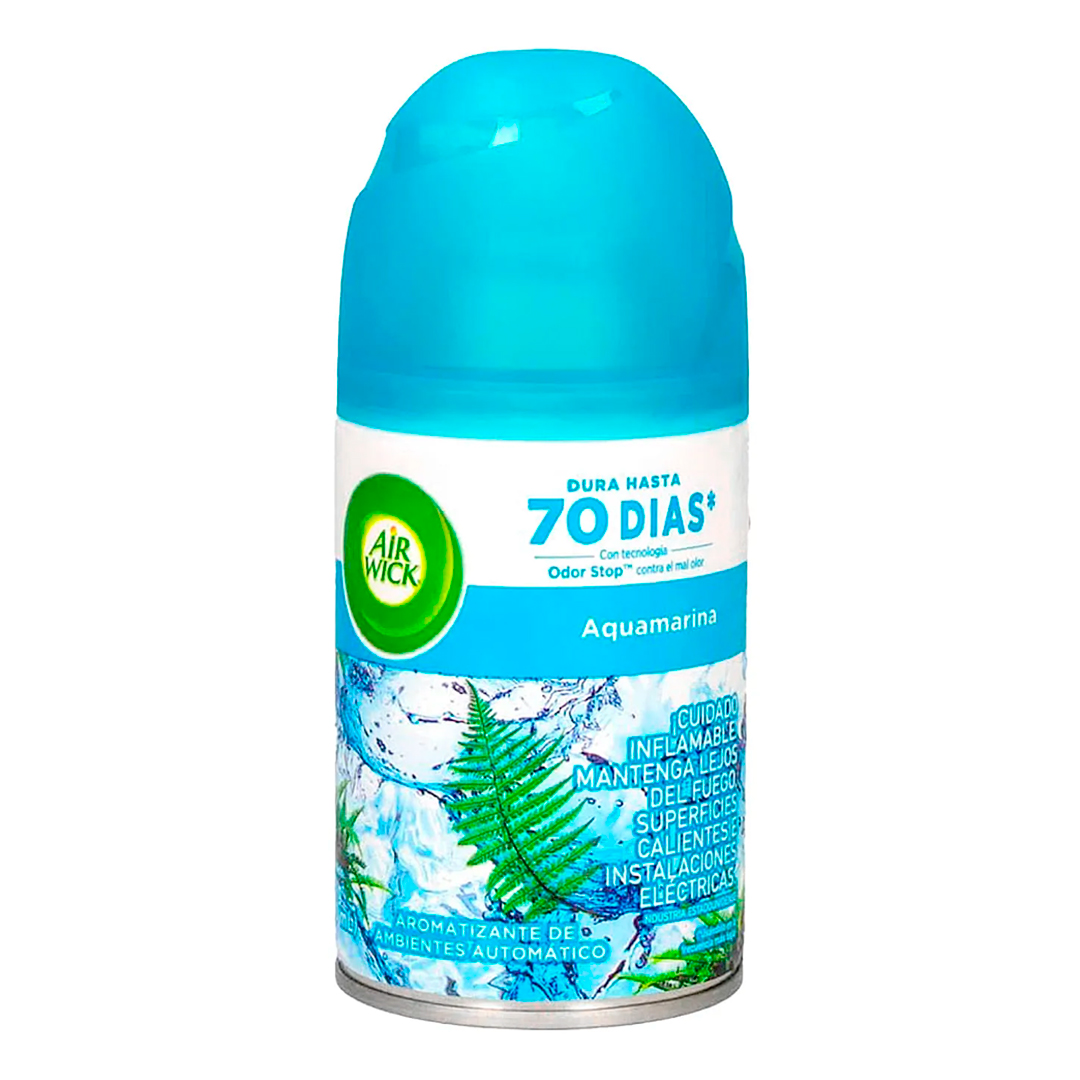 Ambiental Freshmatic aroma AQUAMARINA de 250 ml c/u de repuesto Pack x 2 unidades. Rinde hasta 60 días con uso regular. Libera fragancia en intervalos programados para una cobertura continua. Tecnología de pulverización seca que no deja residuos. Ideal para habitaciones de hasta 20 m²