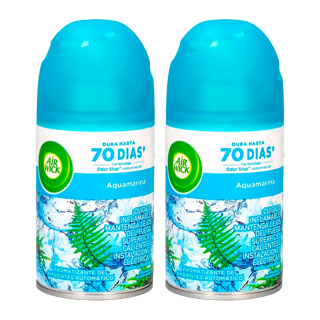 Ambiental Freshmatic aroma AQUAMARINA de 250 ml c/u de repuesto Pack x 2 unidades. Rinde hasta 60 días con uso regular. Libera fragancia en intervalos programados para una cobertura continua. Tecnología de pulverización seca que no deja residuos. Ideal para habitaciones de hasta 20 m²